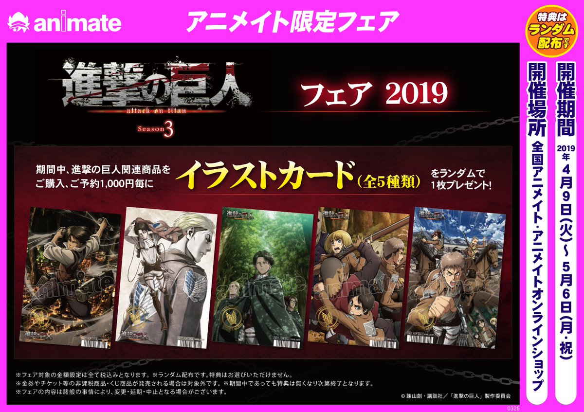 アニメイト天王寺 営業時間は11時から19時までです בטוויטר フェア情報 進撃の巨人フェア 19 好評開催中です 期間中 進撃 の巨人関連商品をご購入 ご予約1 000円毎にイラストカード 全5種 をランダムでプレゼント 書籍新刊 進撃の巨人 28 1冊で